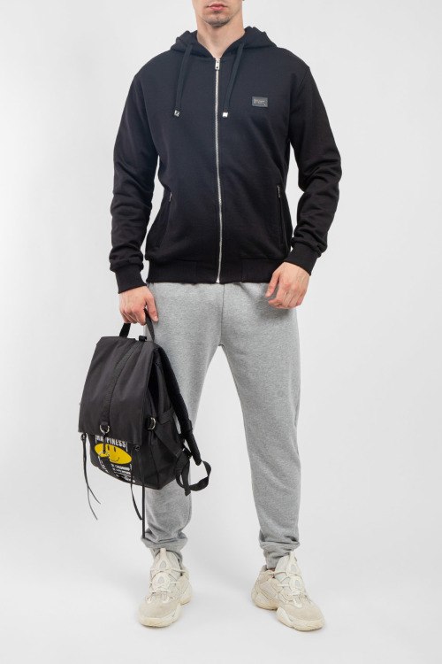 Мужская черная спортивная кофта из хлопка от Dolce & Gabbana (Дольче энд Габбана). Вшитый капюшон, застежка на молнию, прорезные карманы на молнии, патч-лого, трикотажная резинка на манжетах и по низу изделия.