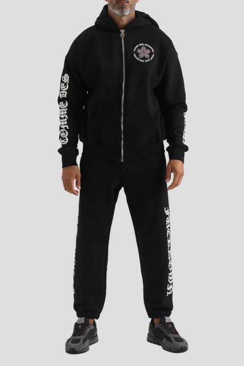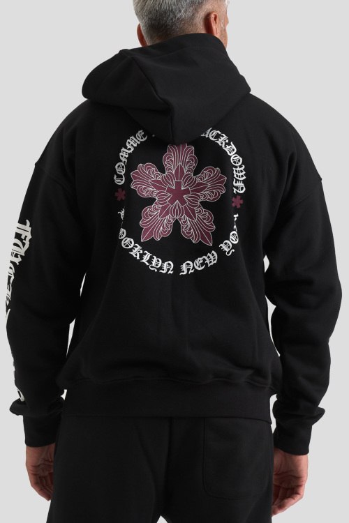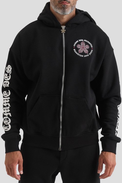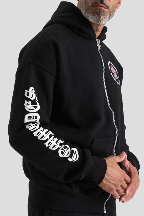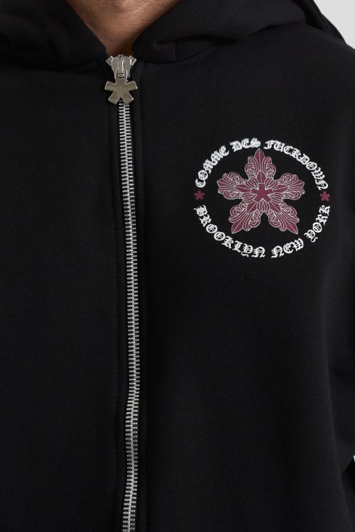 Детали: Мужская черная спортвиная кофта из хлопкового микса от Comme des Fuckdown (Камм дес Факдаун). Вшитый капюшон, застежка на молнию, длинные рукава, трикотажная резинка на манжетах и по низу изделия, боковые карманы, модель декорированы брендированым принтом на спине, груди и вдоль рукавов