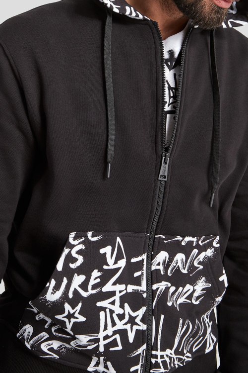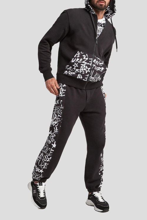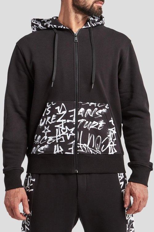 Детали: Мужская черная спортивная кофта из хлопка от Versace (Версаче). Классическая длина, застежка на молнию, вшитый капюшон с кулиской, трикотажная резинка на манжетах и по низу изделия, накладные карманы, дизайн с брендированным принтом на капюшоне и на карманах, утепленная модель флисом