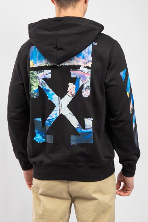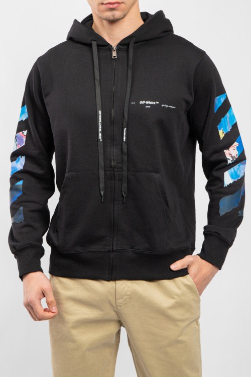 Мужская черная хлопковая спортивная кофта от Off-White (Офф-Вайт). Логотип на груди и на спине, принт на рукавах, капюшон на завязках, боковые карманы, застежка-молния, классическая длина, трикотажные манжеты и нижний край.