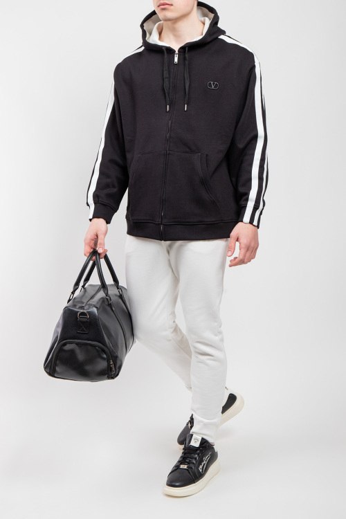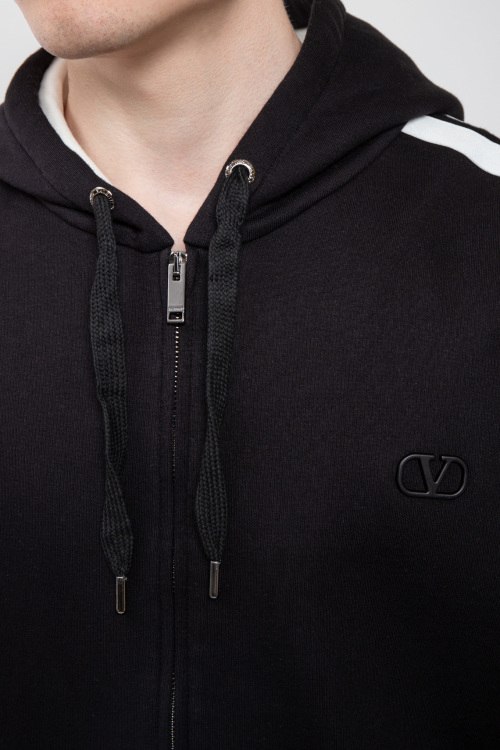 Мужская черная спортивная кофта из хлопка от Valentino (Валентино). Классическая длина, застежка на молнию, вшитый капюшон, контрастные лампасы, накладные карманы, трикотажная резинка на манжетах и по низу изделия.