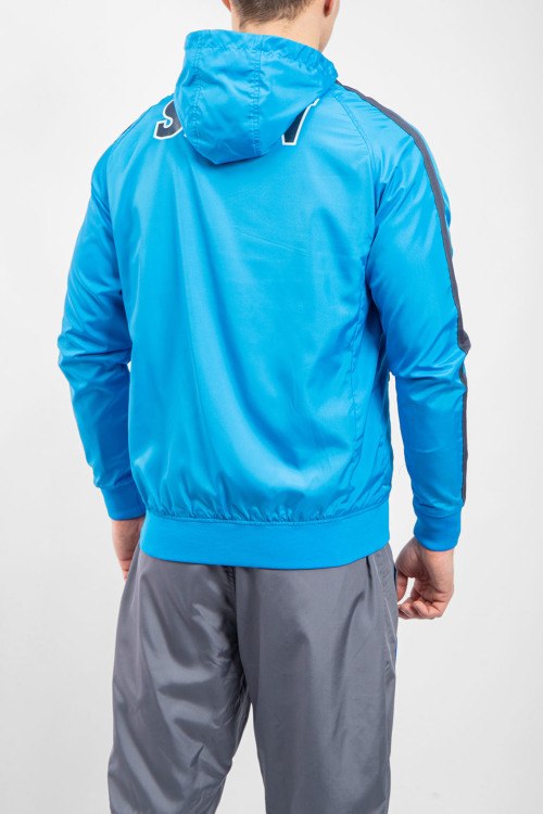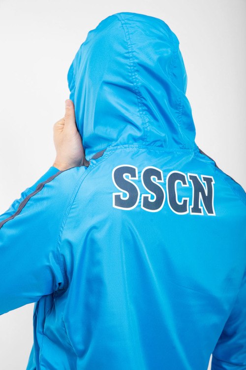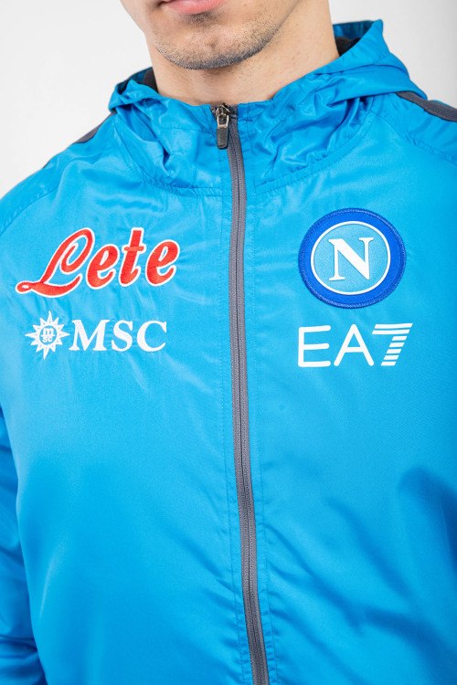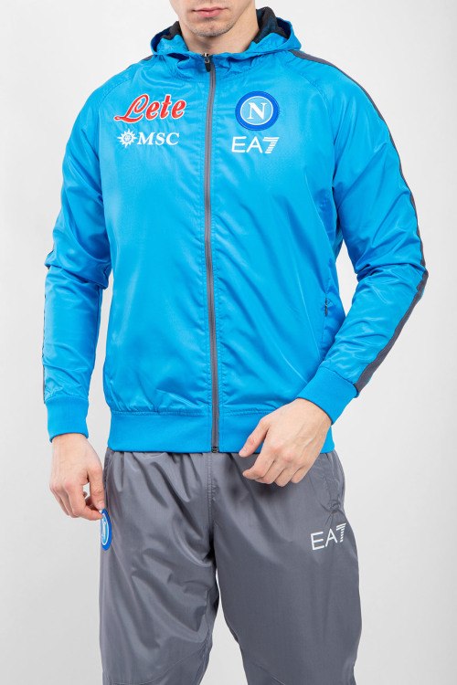 Детали: Мужская голубая спортивная кофта SSC Napoli от EA7 Emporio Armani (ЕА7 Эмпорио Армани). Принт на груди и на спине, лампасы вдоль рукавов, боковые карманы на молнии, застежка-молния, классическая длина, трикотажные манжеты и нижний край