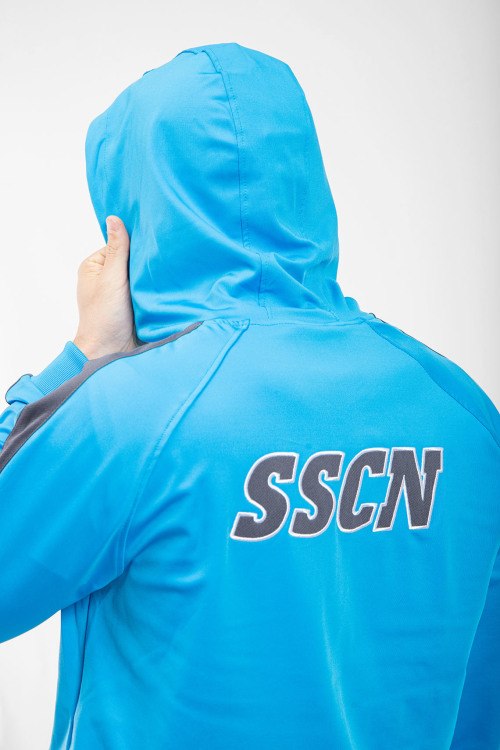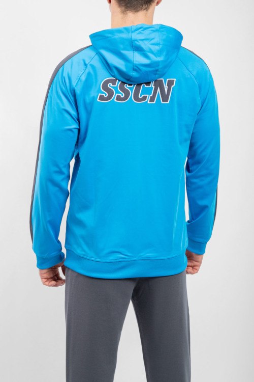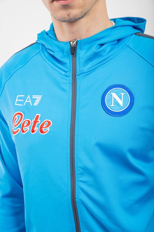 Мужская голубая спортивная кофта SSC Napoli от EA7 Emporio Armani (ЕА7 Эмпорио Армани). Модель с капюшоном, логотип на груди и на спине, лампасы вдоль рукавов, боковые карманы на молнии, застежка-молния, классическая длина, трикотажные манжеты и нижний край.