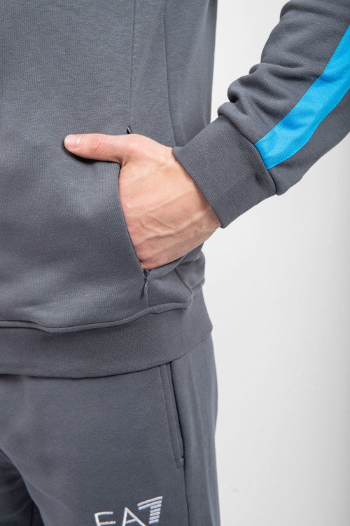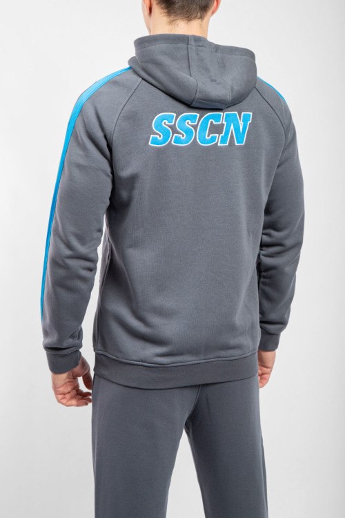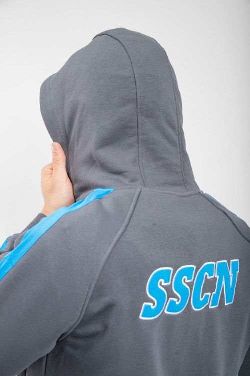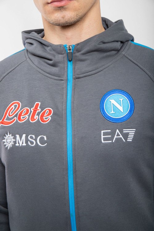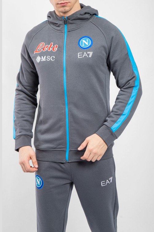 Детали: Мужская серая хлопковая спортивная кофта SSC Napoli от EA7 Emporio Armani (ЕА7 Эмпорио Армани). Модель с капюшоном, вышивка на груди и на спине, лампасы вдоль рукавов, боковые карманы на молнии, застежка-молния, классическая длина, трикотажные манжеты и нижний край
