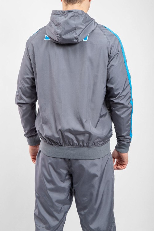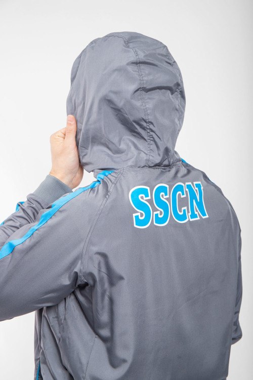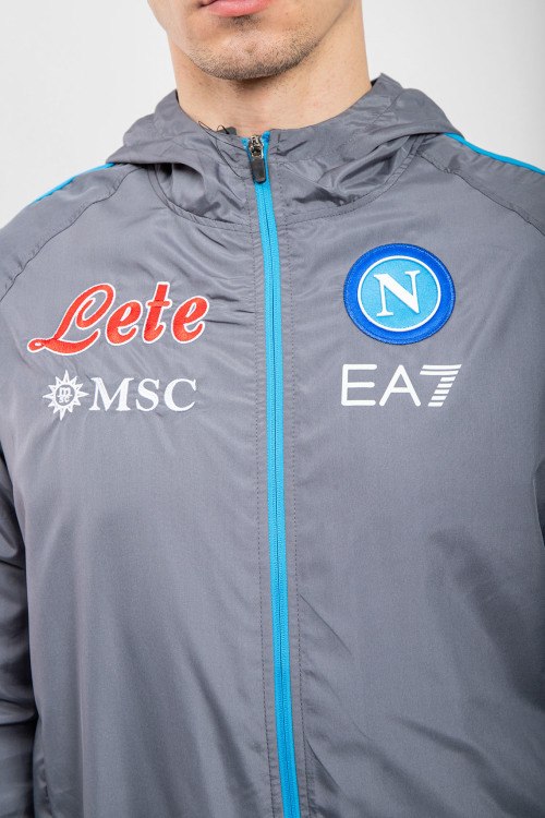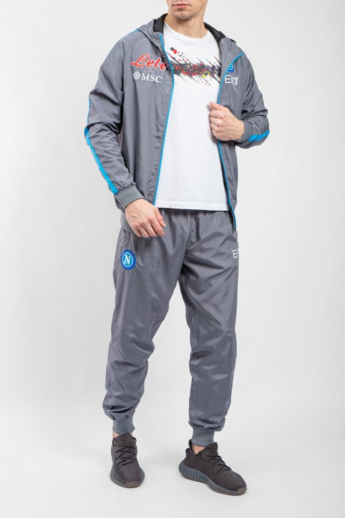 Детали: Мужская серая спортивная кофта SSC Napoli от EA7 Emporio Armani (ЕА7 Эмпорио Армани). Принт на груди и на спине, лампасы вдоль рукавов, боковые карманы на молнии, застежка-молния, классическая длина, трикотажные манжеты и нижний край
