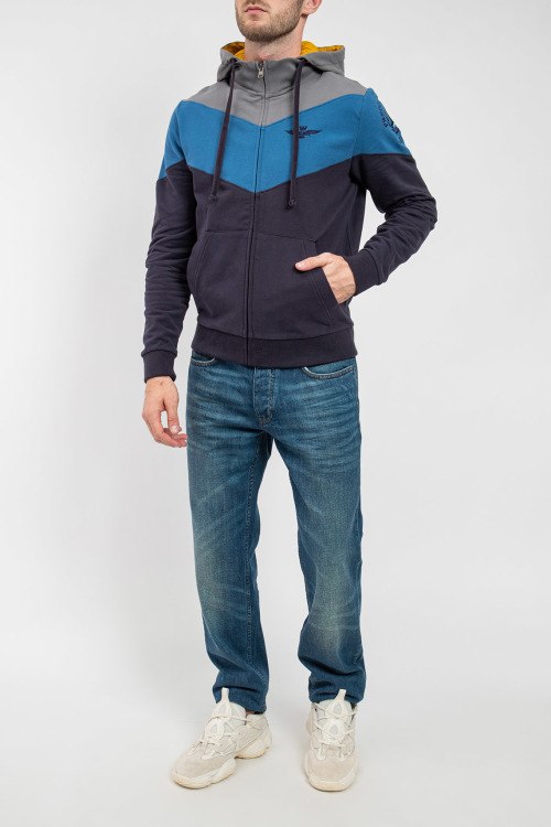Мужская темно-синяя спортивная кофта из хлопкового микса от Aeronautica Militare (Аэронавтика Милитари). Комбинированный дизайн, вшитый капюшон, высокий воротник-стойка, застежка на молнию, вышитый логотип бренда, трикотажная резинка на манжетах и по низу изделия, прорезные карманы.