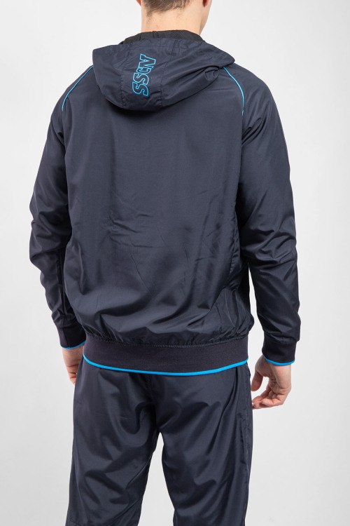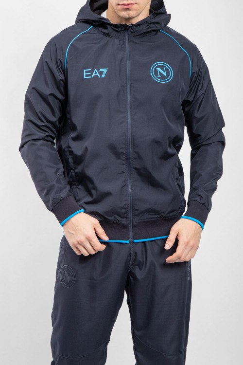 Мужская темно-синяя спортивная кофта SSC Napoli от EA7 Emporio Armani (ЕА7 Эмпорио Армани). Модель с капюшоном, логотип на груди и на спине, боковые карманы, застежка-молния, классическая длина, трикотажные манжеты и нижний край.