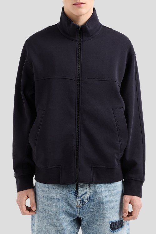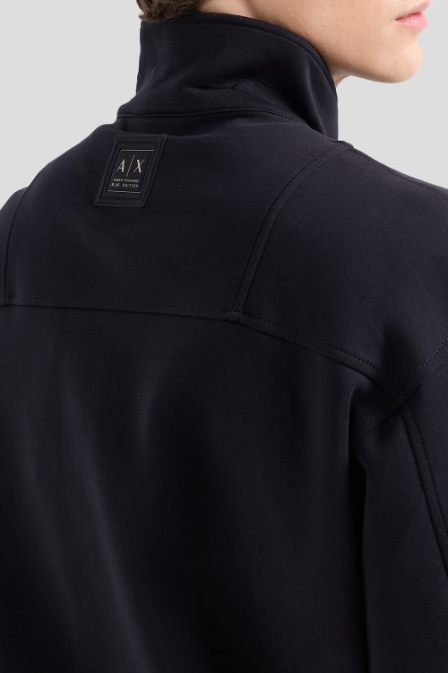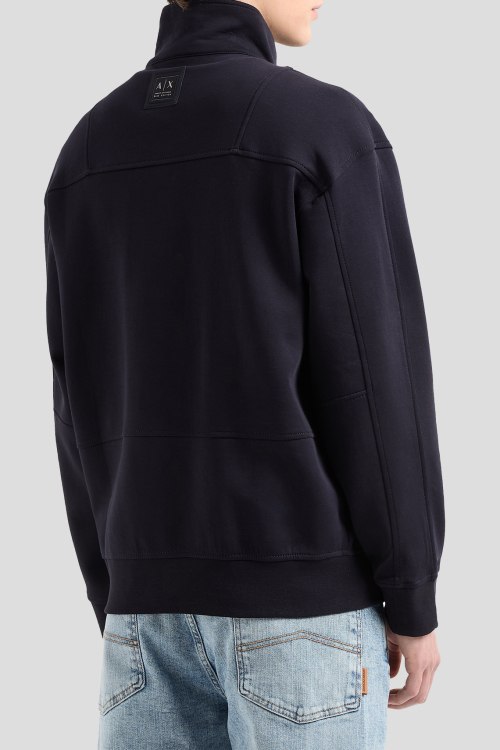 Детали: Мужская темно-синяя хлопковая спортивная кофта от Armani Exchange (Армани Эксчендж). Высокий воротник, нашивка с логотипом на спине, боковые карманы, застежка-молния, классическая длина, трикотажные манжеты и нижний край