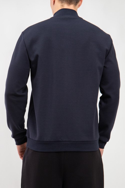 Мужская темно-синяя хлопковая спортивная кофта от EA7 Emporio Armani (ЕА7 Эмпорио Армани). Высокий воротник, логотип на груди, боковые карманы, застежка-молния, классическая длина, трикотажные манжеты и нижний край.