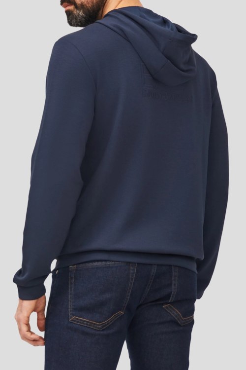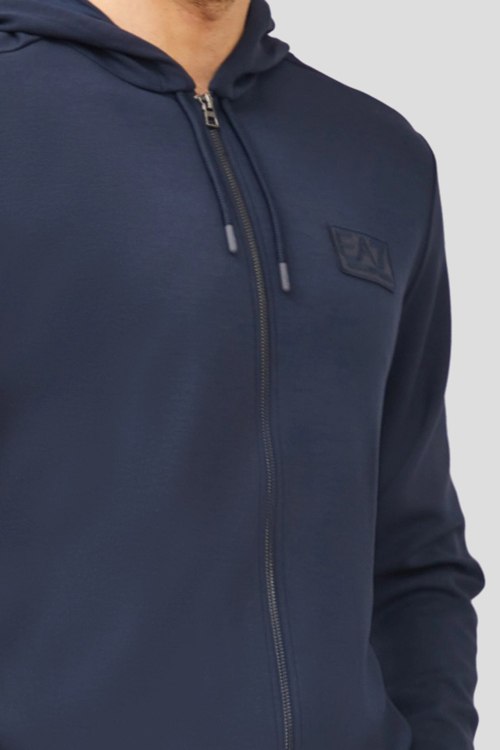 Детали: Мужская темно-синяя спортивная кофта от Armani (Армани). Капюшон на завязках, логотип на груди, боковые карманы, застежка-молния, классическая длина, трикотажные манжеты и нижний край