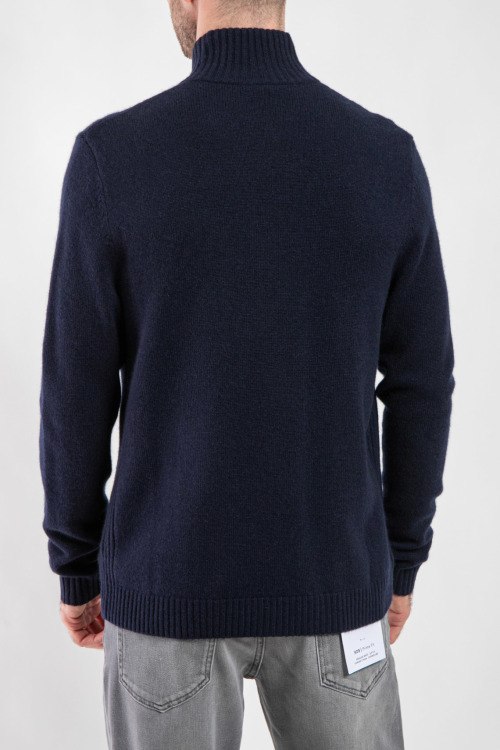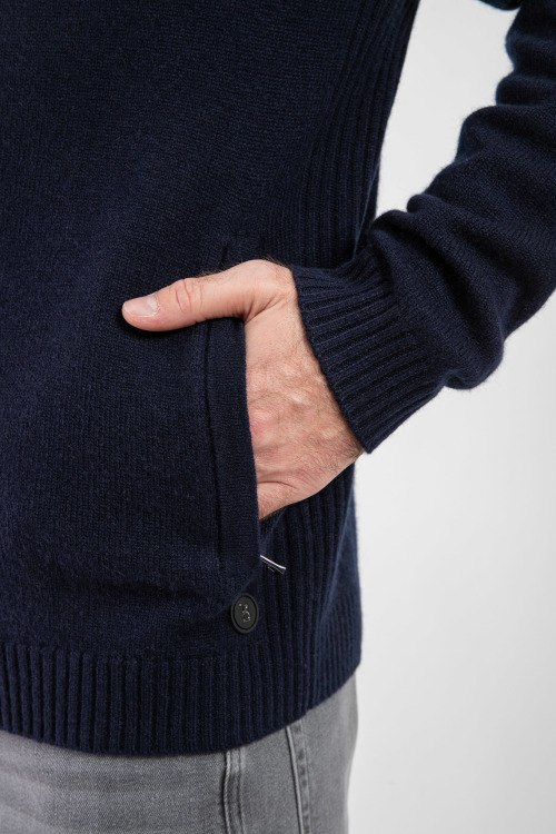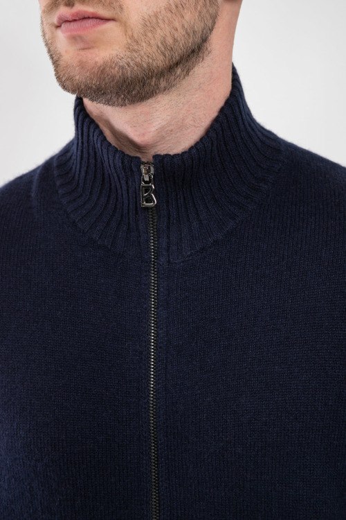 Детали: Мужской темно-синий кардиган Dexter Knit из шерсти и кашемира от Bogner (Богнер). Высокий воротник-стойка, застежка на молнию, длинные рукава, манжеты и низ изделия, прорезные карманы на молнии