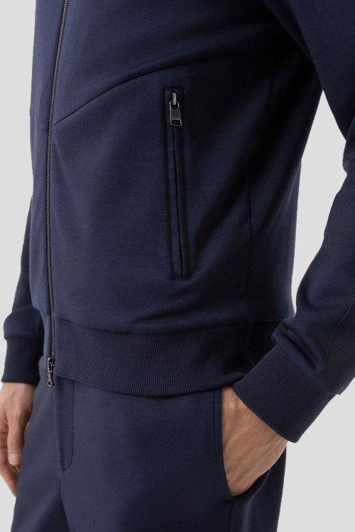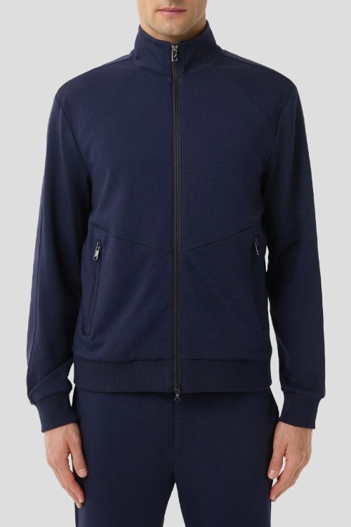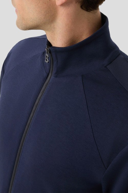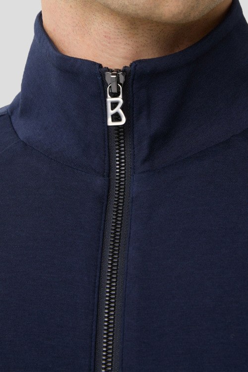 Детали: Мужская темно-синяя спортивная кофта из хлопка и модала Severin от Bogner (Богнер). Высокий воротник, боковые карманы на молнии, застежка-молния, классическая длина, трикотажные манжеты и нижний край