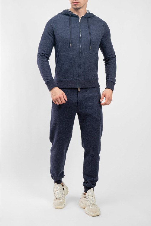 Мужская темно-синяя спортивная кофта из хлопкового микса от Christian Dior (Кристиан Диор). Спортивная кофта на молнии, вшитый капюшон с кулиской, трикотажная резинка на манжетах и по низу изделия, вышитый логотип бренд. Вы можете дополнить свой образ темно-синими хлопковыми спортивными брюками от Christian Dior