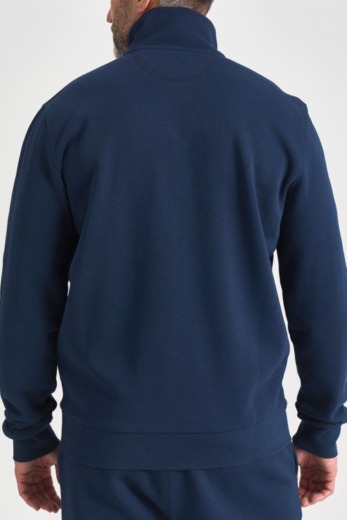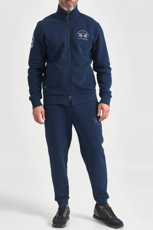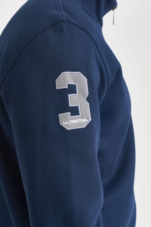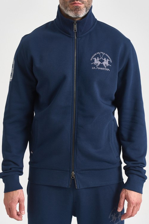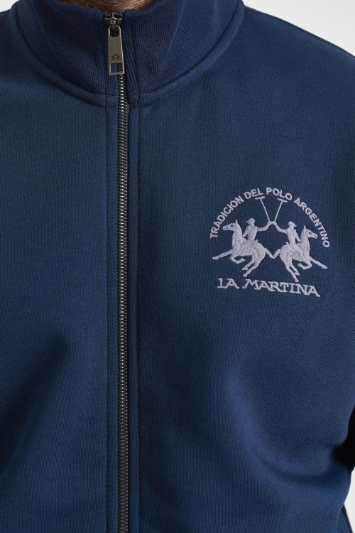 Детали: Мужская темно-синяя хлопковая спортивная кофта от La Martina (Ла Мартина). Логотип на груди, нашивка на рукаве, высокий воротник, боковые карманы, застежка-молния, классическая длина, трикотажные манжеты и нижний край. Параметры модели: 103 см - 87 см - 99 см. Рост - 182 см. Размер на фото - L