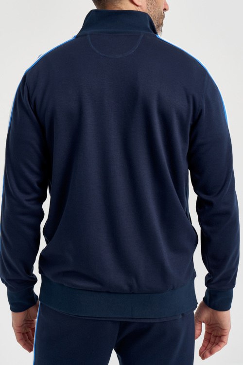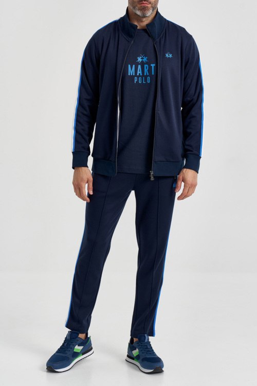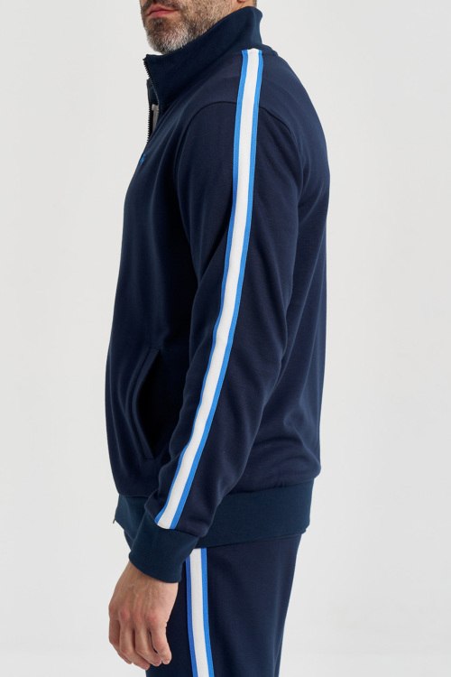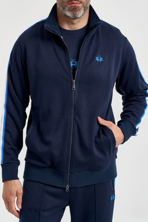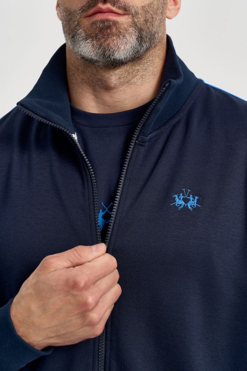 Детали: Мужская темно-синяя спортивная кофта из акрила и вискозы от La Martina (Ла Мартина). Логотип на груди, лампасы вдоль рукавов, высокий воротник, боковые карманы, застежка-молния, классическая длина, трикотажные манжеты и нижний край. Параметры модели: 103 см - 87 см - 99 см. Рост - 182 см. Размер на фото - L