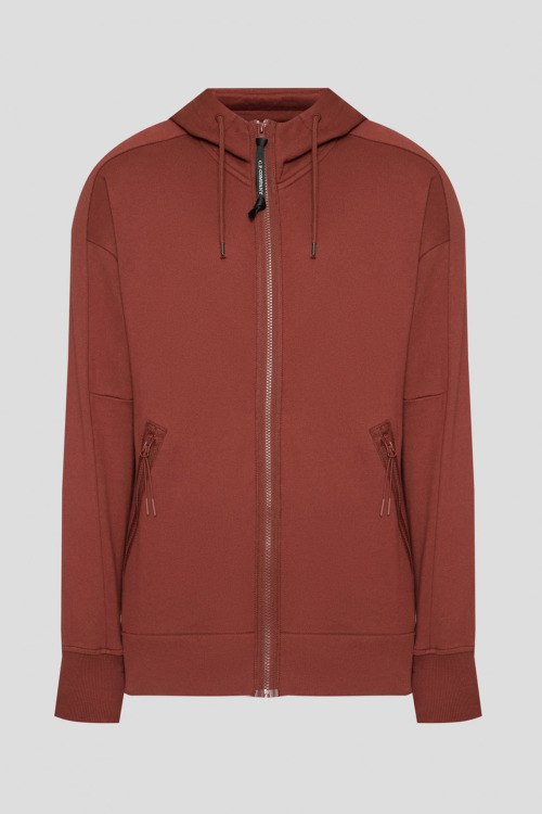 Детали: Мужская терракотовая спортивная кофта от C.P. Company (СиПи Компани). Вшитый капюшон со встроенными защитными линзами, застежка на молнию, длинные рукава, трикотажные манжеты, боковые карманы на молнии. Замеры: длина рукава: длинный, для размера М - 54 см, обхват груди: для размера М - 108 см, обхват талии: для размера М - 102 см, длина изделия по среднему шву спинки от горловины: для размера М - 68 см