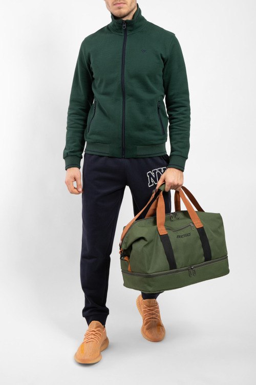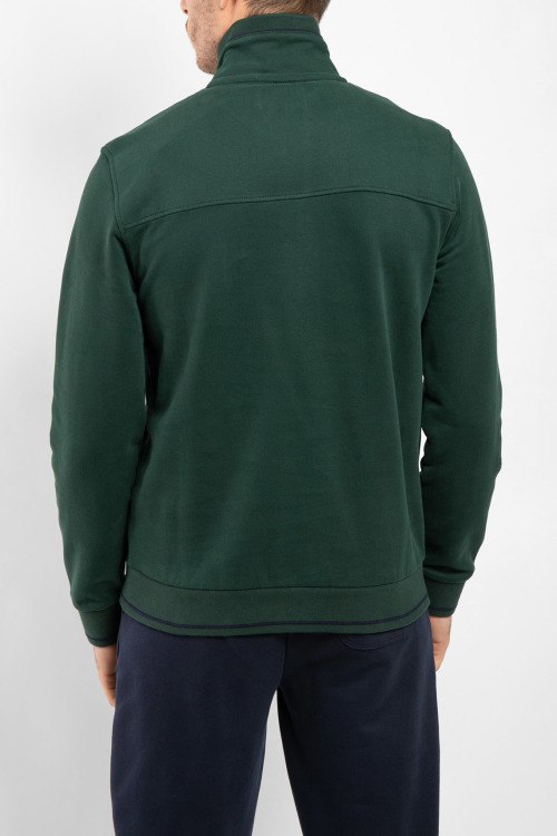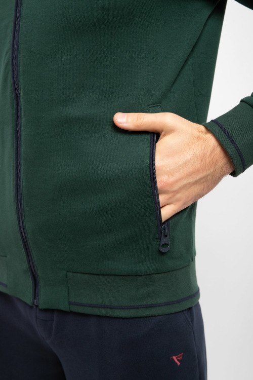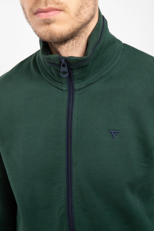 Мужская зеленая спортивная кофта из хлопка от Fred Mello (Фред Мелло). Высокий воротник-стойка, застежка на молнию, прорезные карманы, вышитый логотип бренда, манжеты и низ изделия в рубчик.
