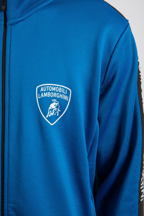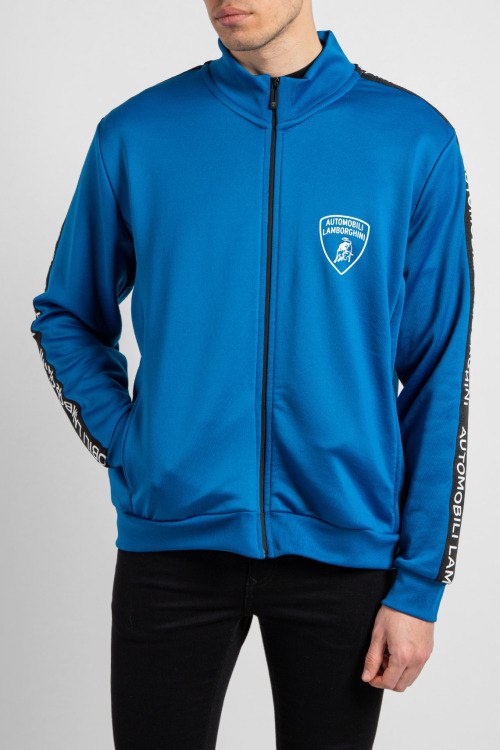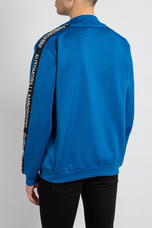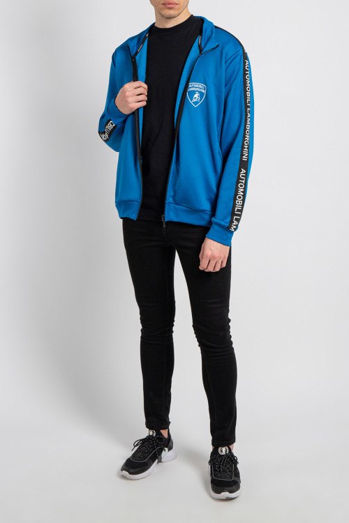 Детали: Мужская синяя спортивная кофта из хлопкового микса от Automobili Lamborghini(Автомобили Ламборгини). Классическая длина, длинные рукава, застежка-молния черного цвета, манжеты и низ изделия на трикотажной резинке, на груди принт с логотипом бренда