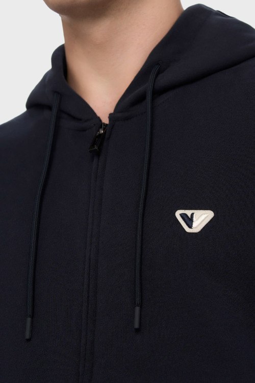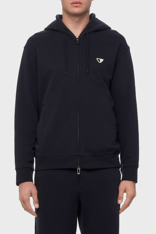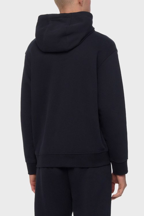 Детали: Мужская темно-синяя спортивная кофта из хлопка и кашемира от Emporio Armani (Эмпорио Армани). Вшитый капюшон, застежка на молнию с кулиской, длинные рукава, трикотажная резинка на манжетах и по низу изделия, патч-лого, боковые карманы