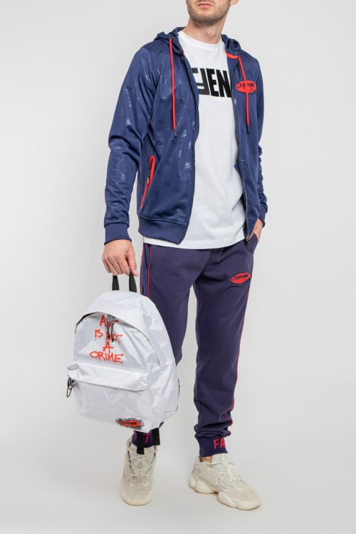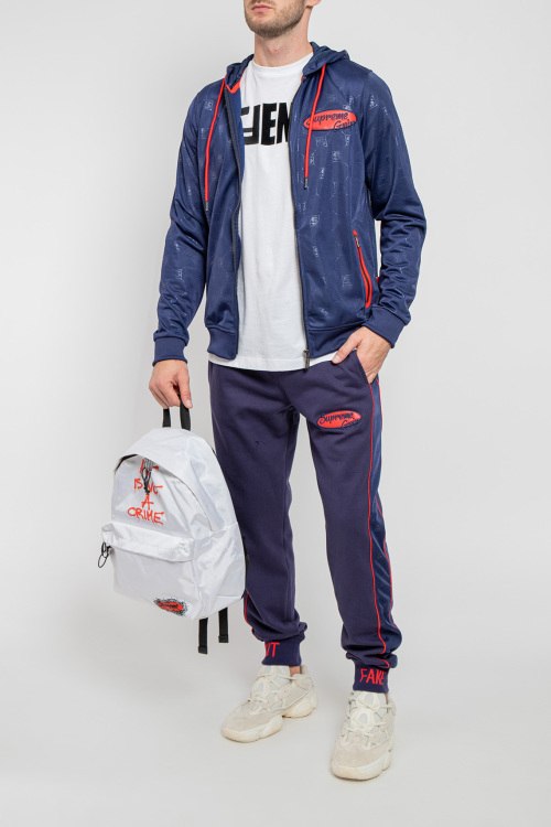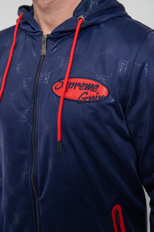 Мужская темно-синяя хлопковая спортивная кофта от Supreme Grip (Суприм Грип). Монограмма бренда по всей поверхности, нашивка с логотипом на груди, принт Not Fake на спине, капюшон на завязках, боковые карманы на молнии, застежка-молния, классическая длина, трикотажные манжеты и нижний край.
