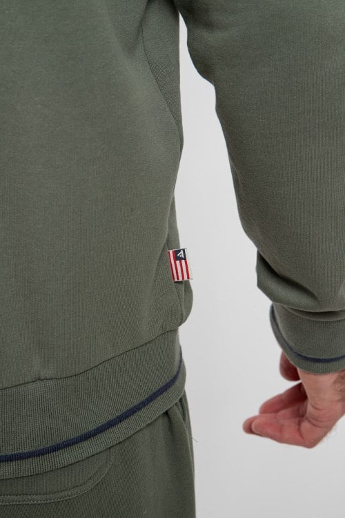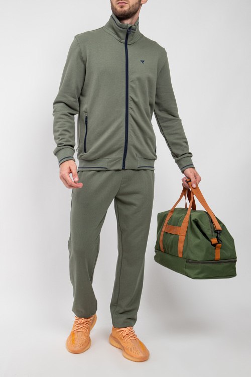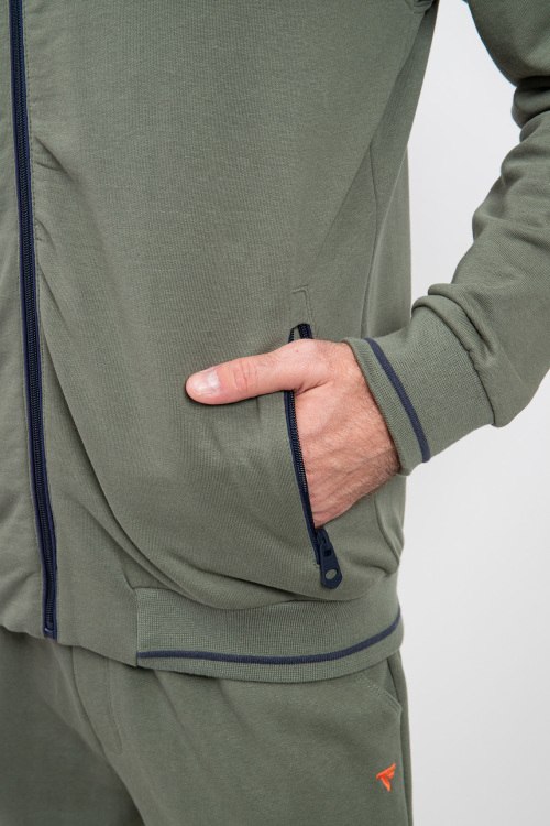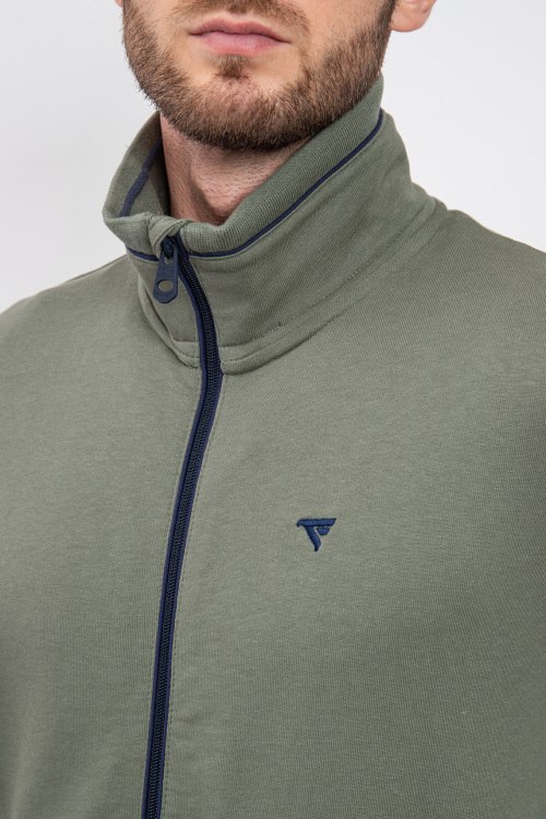 Мужская оливковая хлопковая спортивная кофта от Fred Mello (Фред Мелло). Логотип на груди, высокий воротник, боковые карманы на молнии, застежка-молния, классическая длина, трикотажные манжеты и нижний край.