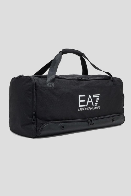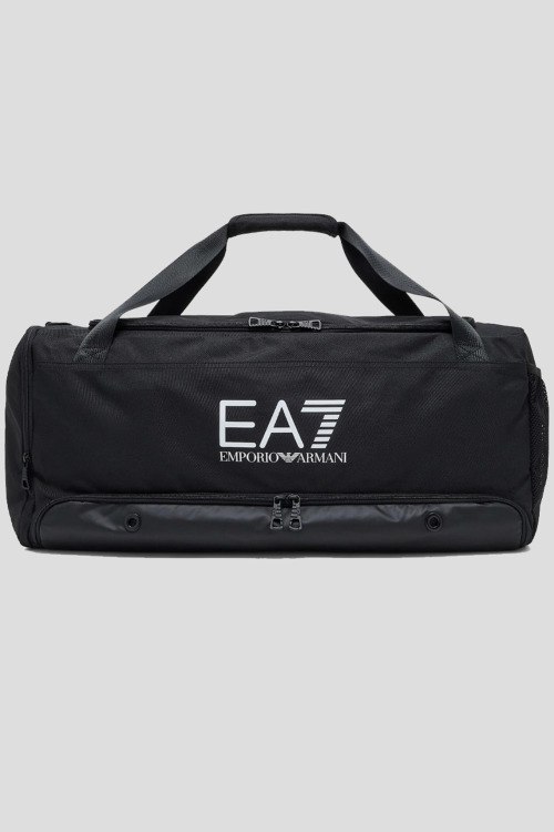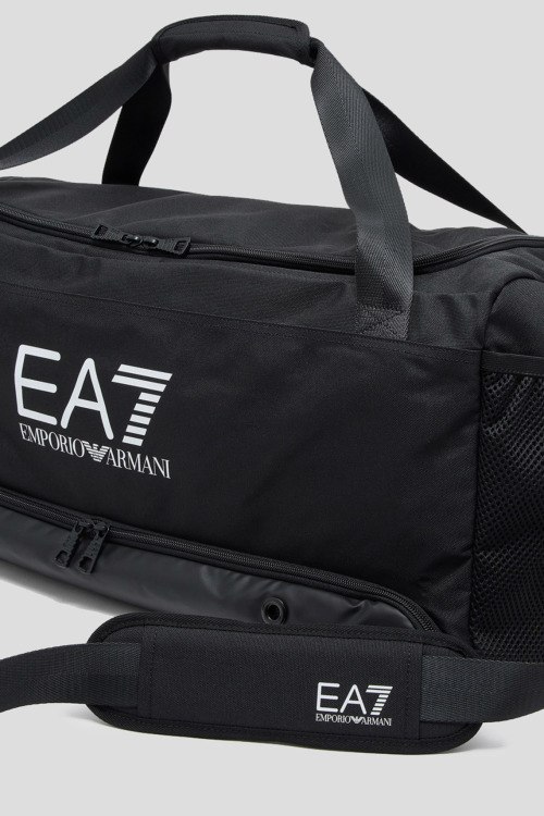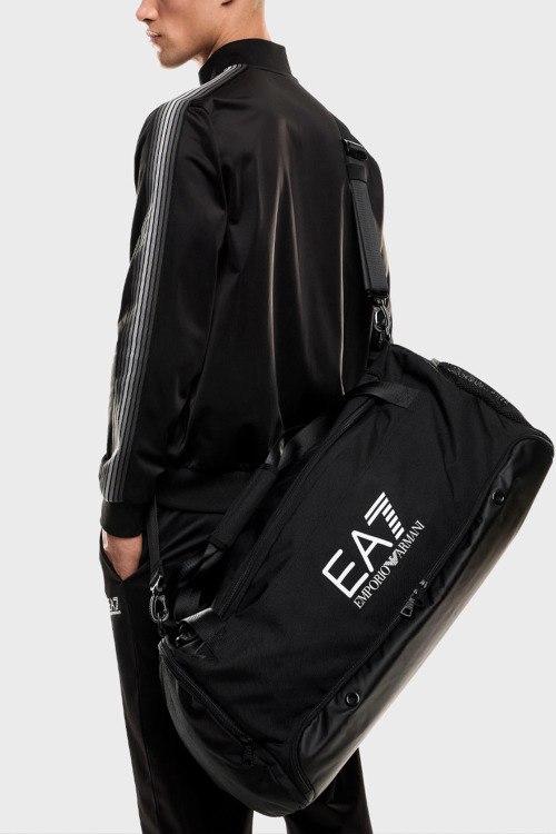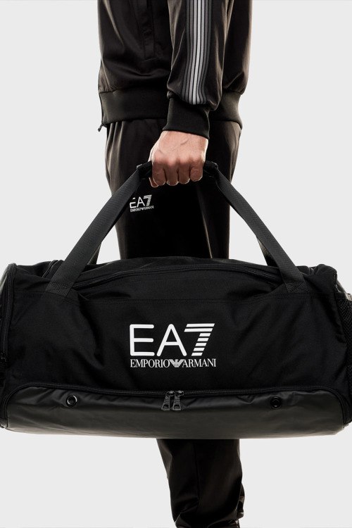 Детали: Мужская черная текстильная спортивная сумка от EA7 Emporio Armani (ЕА7 Эмпорио Армани). Принт с логотипом, два боковых кармана, две верхние ручки, съемный плечевой ремень, застежка-молния, одно отделение. Размеры: 63 x 23,5 x 30 см