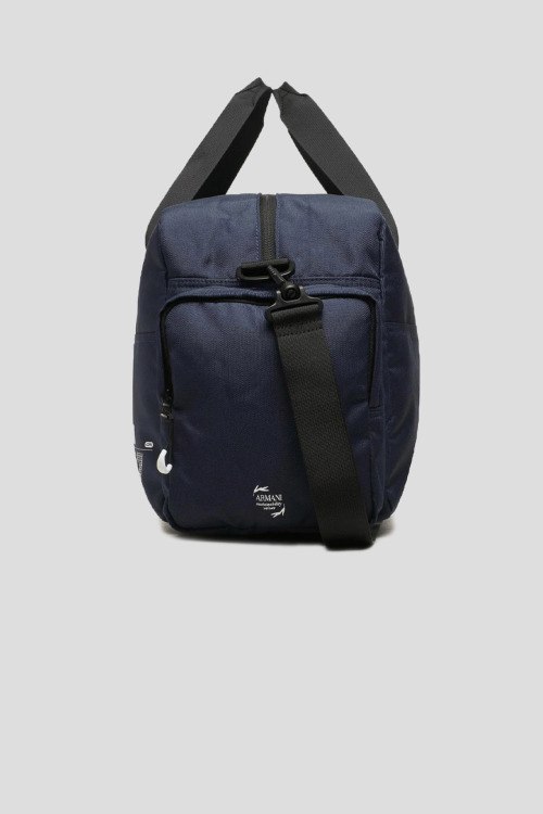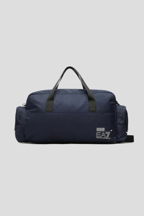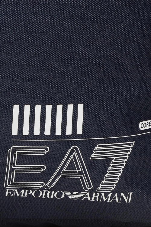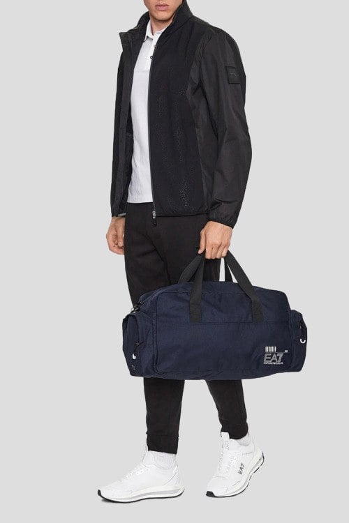 Детали: Мужская темно-синяя текстильная спортивная сумка от EA7 Emporio Armani (ЕА7 Эмпорио Армани). Принт с логотипом, две круглые ручки, съемный плечевой ремень, два боковых кармана на молнии, застежка-молния, одно отделение. Размеры: 58.5 x 28 x 20 см