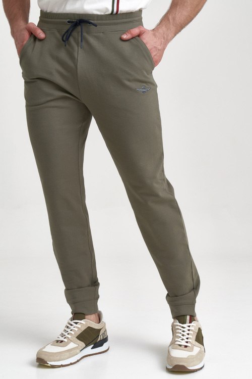 Детали: Мужские спортивные брюки цвета хаки из хлопкового микса от Aeronautica Militare (Аэронавтика Милитари). Классическая длина, эластичная резинка на поясе с кулиской, трикотажная резинка на манжетах, прорезные карманы, вышитый логотип бренда