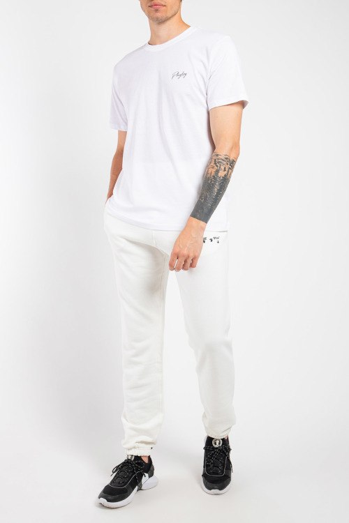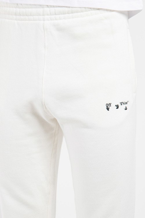 Мужские белые спортивные брюки из хлопка от Off-White (Офф-Вайт). Классическая длина, эластичная резинка на поясе с кулиской, боковые карманы, трикотажная резинка на манжетах, логотип бренда.