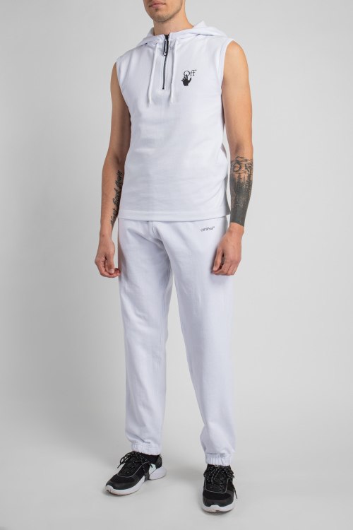 Мужские белые спортивные брюки из хлопка от Off-White (Офф-Вайт). Классическая длина, трикотажная резинка на манжетах, эластичный пояс, боковые карманы, принт с логотипом бренда