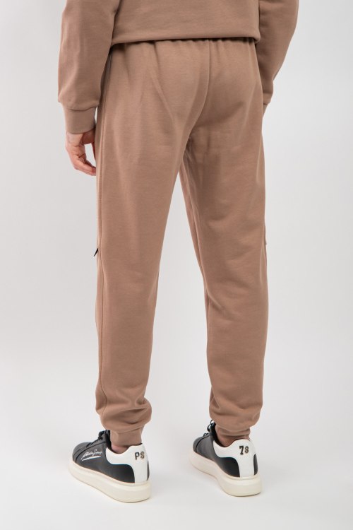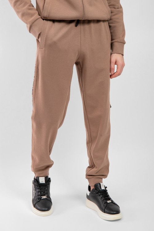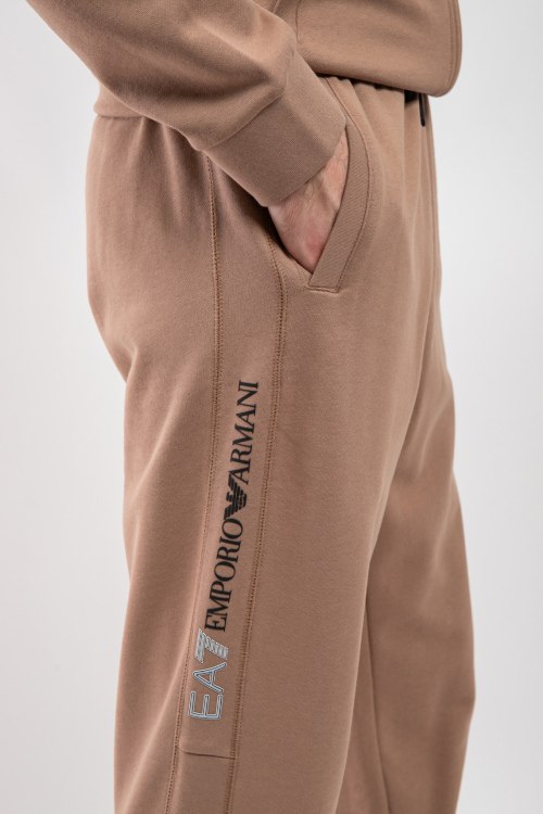 Мужские бежевые хлопковые спортивные брюки от EA7 Emporio Armani (ЕА7 Эмпорио Армани). Эластичный пояс на завязках, боковые карманы, логотип сбоку, трикотажные манжеты, полная длина.