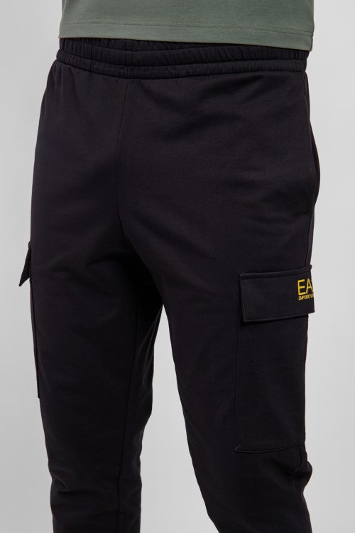 Мужские черные спортивные брюки-карго из хлопка от EA7 Emporio Armani (ЕА7 Эмпорио Армани). Классическая длина, эластичная резинка на поясе, прорезные карманы, накладные карманы с клапаном, трикотажная резинка на манжетах, логотип бренда.