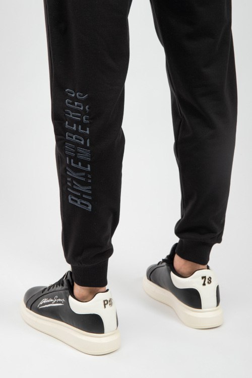 Мужские черные хлопковые спортивные брюки от Bikkembergs (Биккембергс). Эластичный пояс на завязках, принт логотипа, боковые карманы, трикотажные манжеты, полная длина.