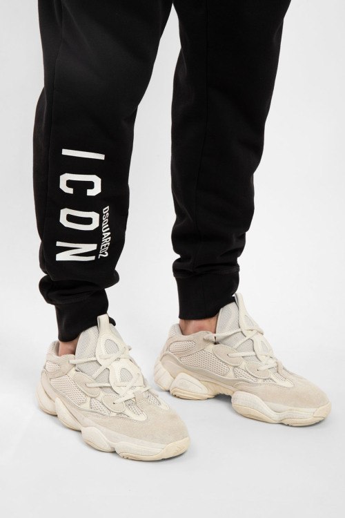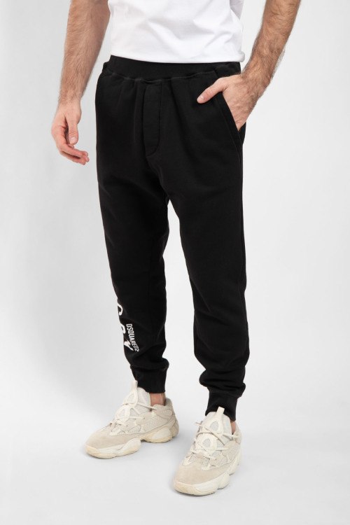 Мужские черные хлопковые спортвиные брюки ICON от Dsquared2 (Дискваред). Эластичный пояс, принт с логотипом, боковые карманы, трикотажные манжеты, полная длина.