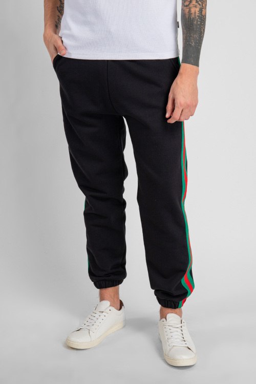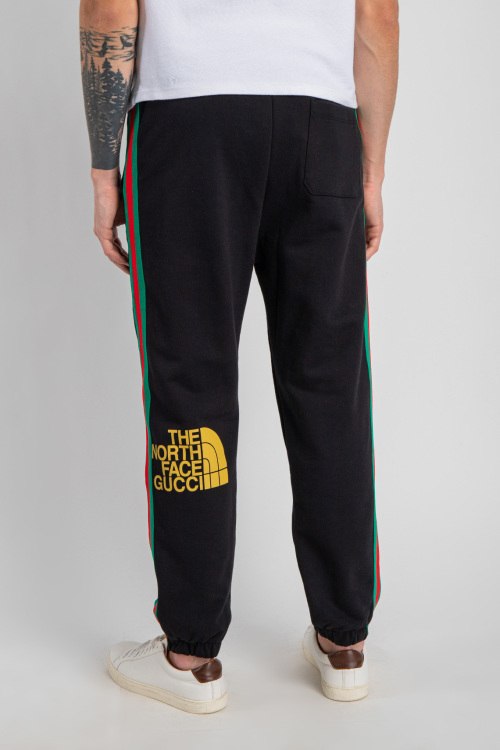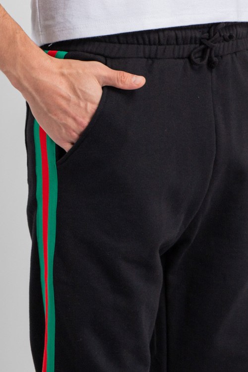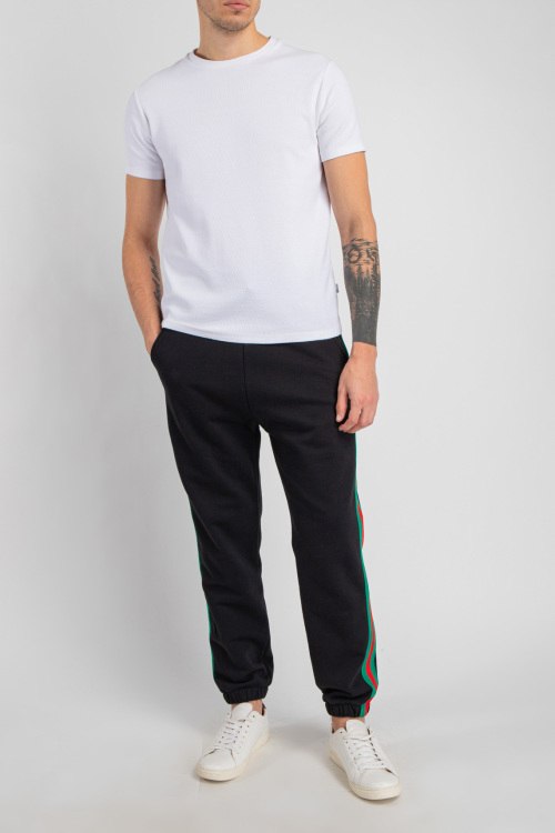 Детали: Мужские черные спортивные брюки из хлопка от Gucci (Гуччи). Классическая длина, трикотажная резинка на манжетах, эластичная резинка с кулиской на поясе, боковые карманы, брендированные лапмасы