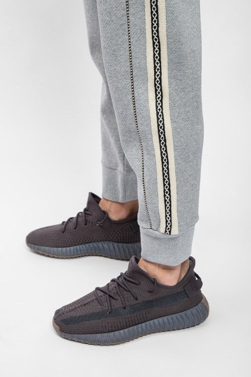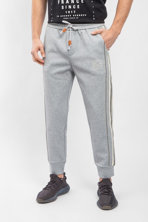 Мужские серые хлопковые спортивные брюки от Loewe (Лоэйве). Эластичный пояс на завязках, вышитый логотип, лампасы, боковые карманы, трикотажные манжеты, полная длина.