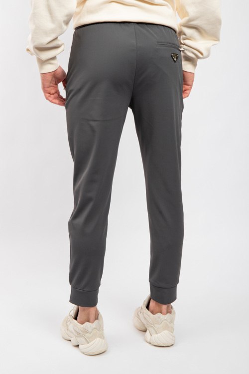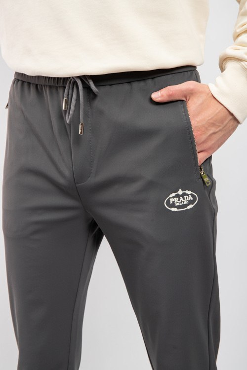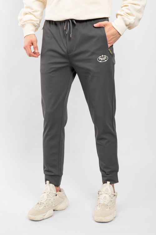 Мужские темно-серые хлопковые спортивные брюки от Prada (Прада). Эластичный пояс на завязках, боковые карманы на молнии, накладной карман сзади, логотип спереди и сзади, трикотажные манжеты, полная длина.