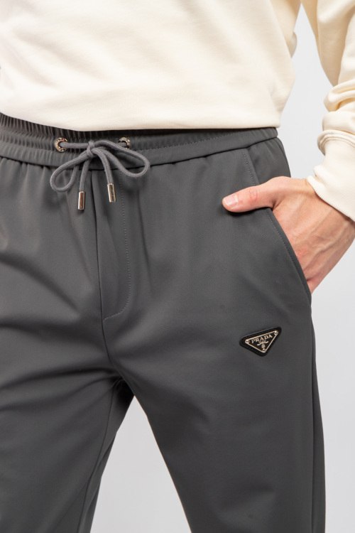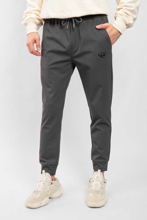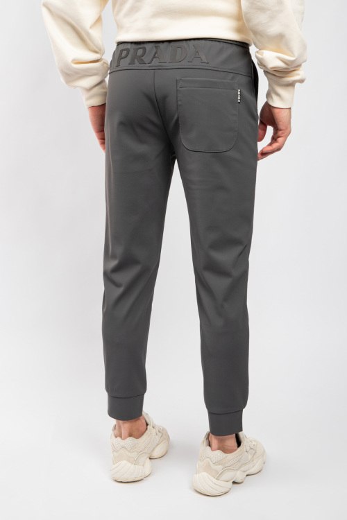 Мужские темно-серые хлопковые спортивные брюки от Prada (Прада). Эластичный пояс на завязках, боковые карманы, накладной карман сзади, логотип спереди и сзади, трикотажные манжеты, полная длина.