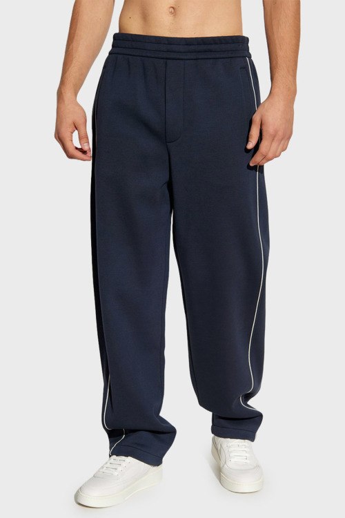 Детали: Мужские темно-синие спортивные брюки из модала от Emporio Armani (Эмпорио Армани). Эластичный пояс, боковые карманы, тонкие лампасы, низ без манжетов, полная длина