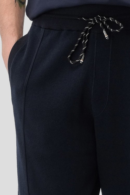 Детали: Мужские темно-синие спортивные брюки из хлопка и шерсти от Hugo Boss (Хуго Босс). Классическая длина, эластичная резинка на поясе с кулиской, прорезные карманы
