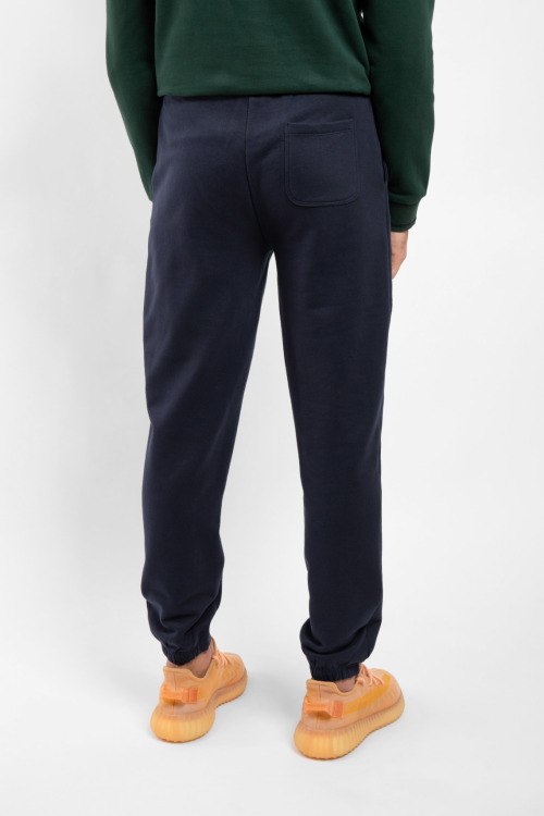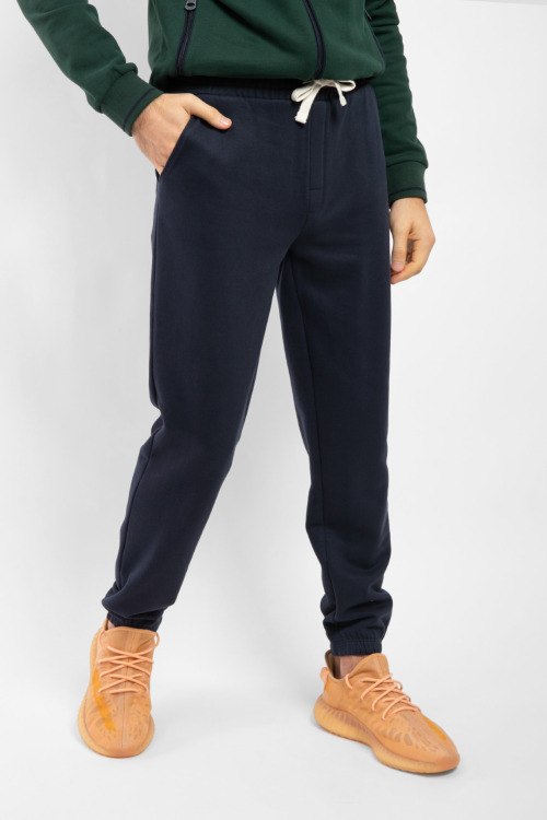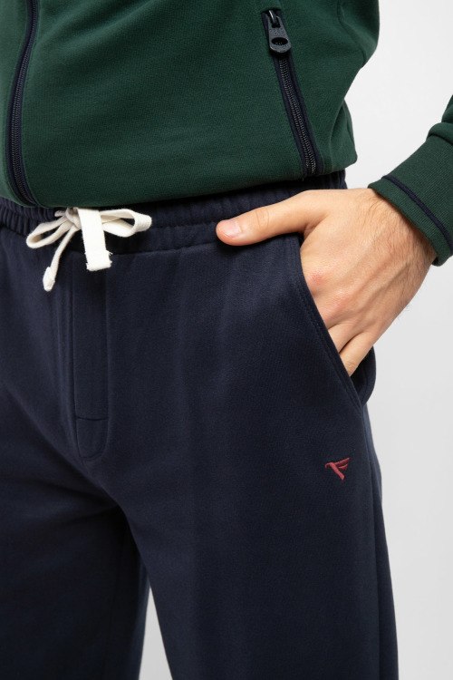 Мужские темно-синие спортивные брюки из хлопкового микса от Fred Mello (Фред Мелло). Классическая длина, эластичная резинка на поясе с кулиской, прорезные карманы, вышитый лого, эластичная резинка на манжетах.