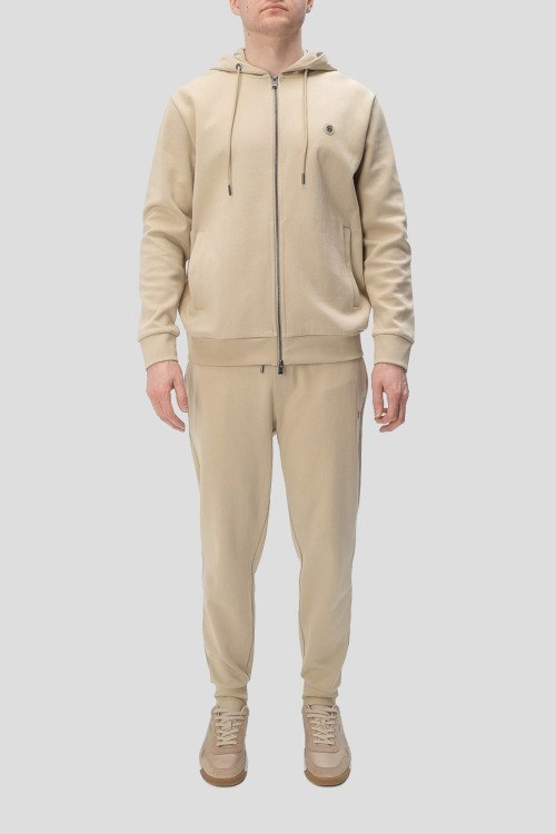 Детали: Мужской бежевый спортивный костюм из хлопкового микса от Hugo Boss (Хуго Босс). Спортивная кофта на молнии, вшитый капюшон с кулиской, прорезные карманы, лого на груди, спортивные брюки с манжетами, эластичная резинка на поясе с кулиской, прорезные карманы