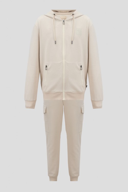 Детали: Мужской бежевый спортивный костюм из хлопка от Joop! (Йооп!). Кофта свободного кроя, вшитый капюшон с кулиской, застежка на молнию, два кармана на молнии, логотип на груди. Брюки-карго с эластичной резинкой на поясе с кулиской, два боковых прорезных кармана, два накладных кармана с клапанами. Замеры: длина рукава: длинный, для размера М - 65 см, обхват груди: для размера М - 108 см, обхват талии: для размера М - 100 см, длина изделия по среднему шву спинки от горловины: для размера М - 68,5 см. Брюки: обхват пояса: для размера М - 88 см, обхват бедер: для размера М - 102 см, длина штанины: для размера М - 99 см, длина по шаговому шву: для размера М - 71 см