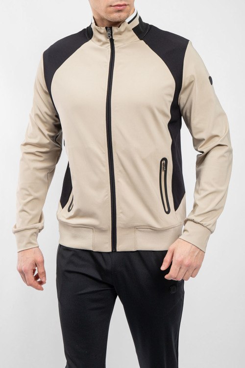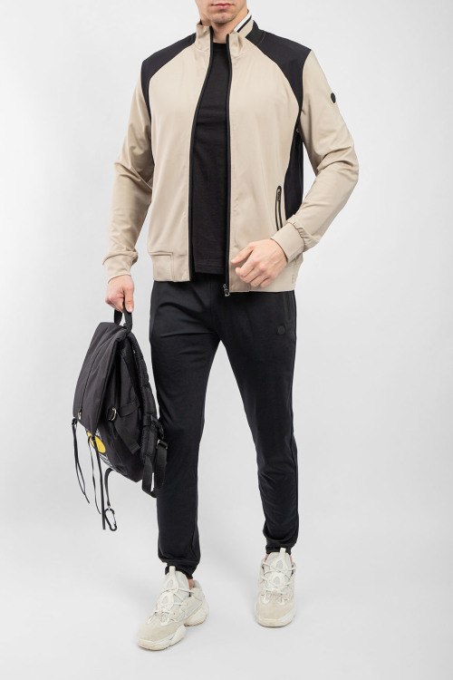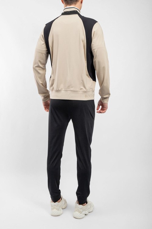 Мужской бежево-черный спортивный костюм от Bogner (Богнер). Кофта: высокий воротник, нашивка с логотипом на рукаве, боковые карманы, застежка-молния, классическая длина, трикотажные манжеты и нижний край. Брюки: эластичный пояс на завязках, боковые карманы, логотип, полная длина.