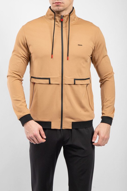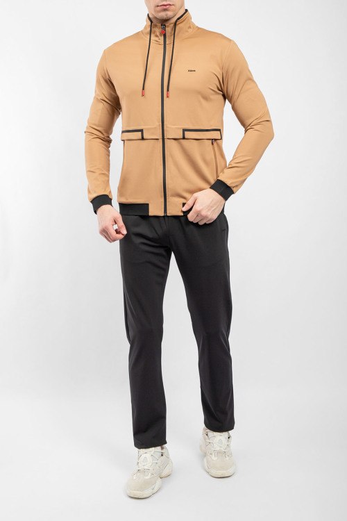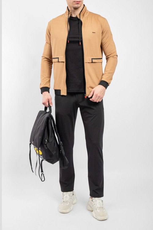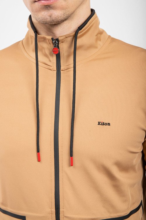 Мужской бежево-черный спортивный костюм от Kiton (Китон). Кофта: высокий воротник, логотип на груди, боковые карманы на молнии, застежка-молния, классическая длина, трикотажные манжеты и нижний край. Брюки: эластичный пояс на завязках, боковые карманы, низ без манжетов, полная длина.