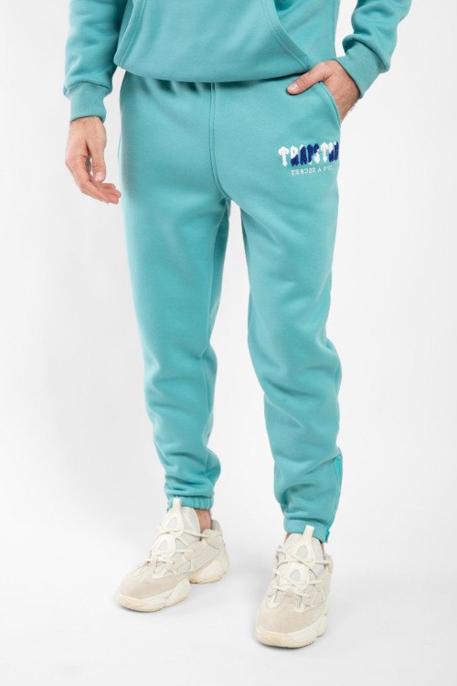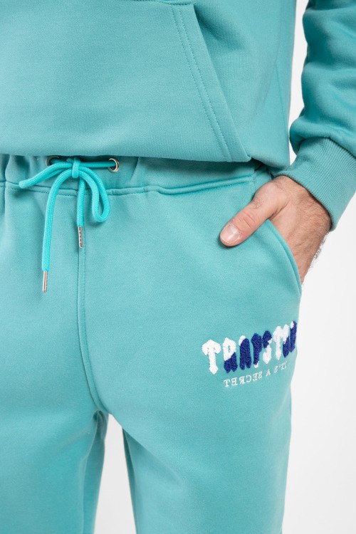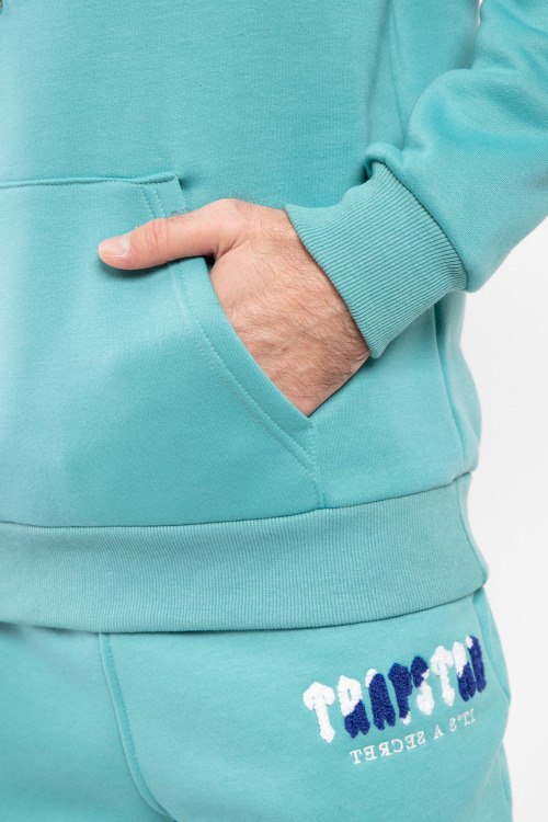 Детали: Мужской бирюзовый спортивный костюм из хлопкового микса от Trapstar (Трепстар). Модель утепленная флисом, худи с вшитым капюшоном, рукава-реглан, манжеты и низ изделия в рубчик, брендированная вышивка на груди, спортивные брюки с эластичной резинкой в поясе, на манжетах сбоку молнии, прорезные карманы, фактурный лого