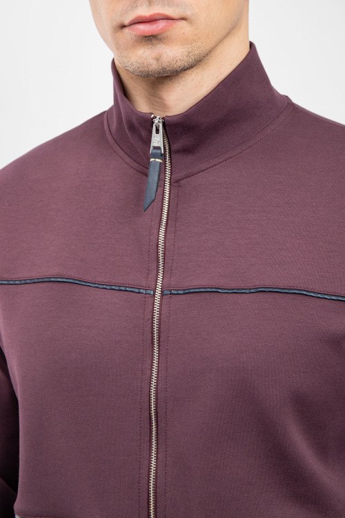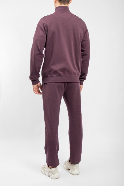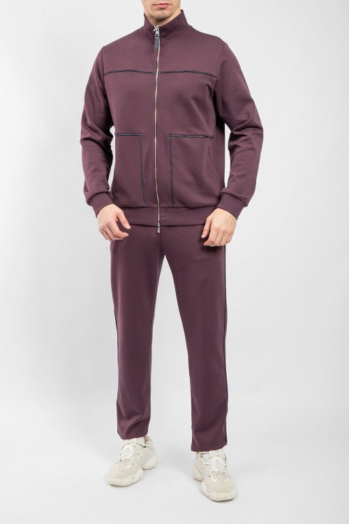 Мужской бордовый хлопковый спортивный костюм от Brunello Cucinelli (Брунелло Кучинелли). Кофта: высокий воротник, боковые карманы, застежка-молния, классическая длина, трикотажные манжеты и нижний край. Брюки: эластичный пояс на завязках, боковые карманы, низ без манжетов, полная длина.
