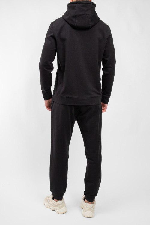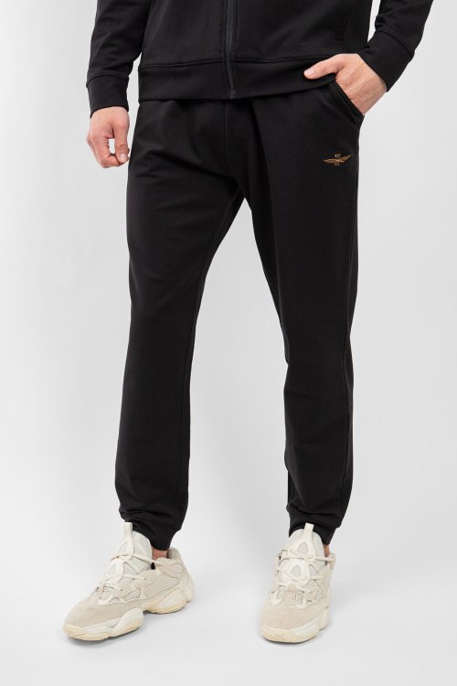 Мужской черный хлопковый спортивный костюм от Aeronautica Militare (Аэронавтика Милитари). Кофта: капюшон на завязках, вышитый логотип на груди, боковые карманы, застежка-молния, классическая длина, трикотажные манжеты и нижний край. Брюки: эластичный пояс на завязках, вышитый логотип, боковые карманы, трикотажные манжеты, полная длина.