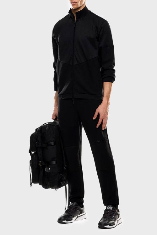 Детали: Мужской черный спортивный костюм из хлопкового микса от EA7 Emporio Armani (ЕА7 Эмпорио Армани). Спортивная кофта на молнии, воротник-стойка, прорезные карманы, логотип бренда, спортивные брюки с сетчатыми вставками, прорезные карманы