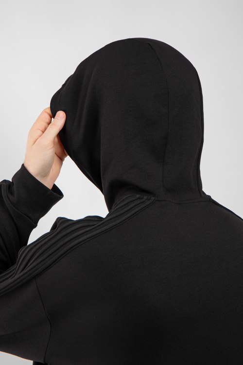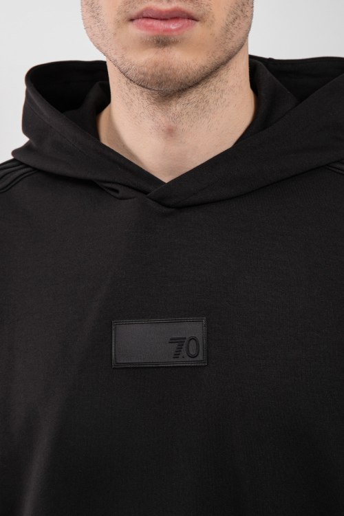Мужской черный спортивный костюм из модала от EA7 Emporio Armani (ЕА7 Эмпорио Армани). Худи: вшитый капюшон, нашивка с логотипом на груди, лампасы вдоль рукавов, карман-кенгуру, классическая длина. Брюки: эластичный пояс, боковые карманы, нашивка с логотипом, лампасы, манжеты на резинке, полная длина.